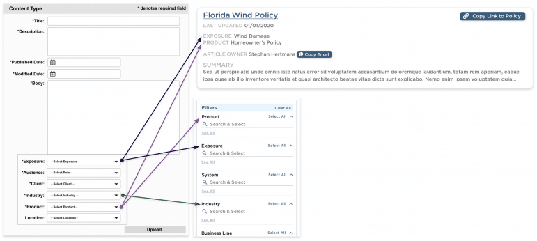 After meeting with users representative of all business units at the organization, EK designed an enterprise taxonomy, accompanying architecture model, and governance plan to ensure the taxonomy stays representative of the company’s information and content on an ongoing basis. This initial taxonomy work guided the design of both content type definition and the search experience, as users will interact with this taxonomy to both describe, tag, and search for content.